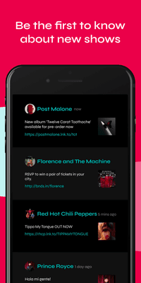 Bandsintown helps you discover concerts near you and notifies you of upcoming gigs by artists you listen to, so you’ll never miss another show.